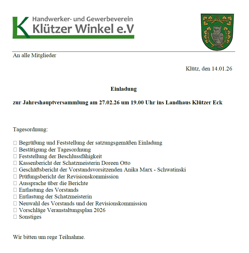 Der Handwerker- und Gewerbeverein Klützer Winkel e.V. wurde 1994 gegründet und versteht sich als Interessenvertretung seiner Mitglieder, zu denen Selbständige aus Handel, Handwerk, Gastronomie, Dienstleistungen und der Freien Berufe gehören.